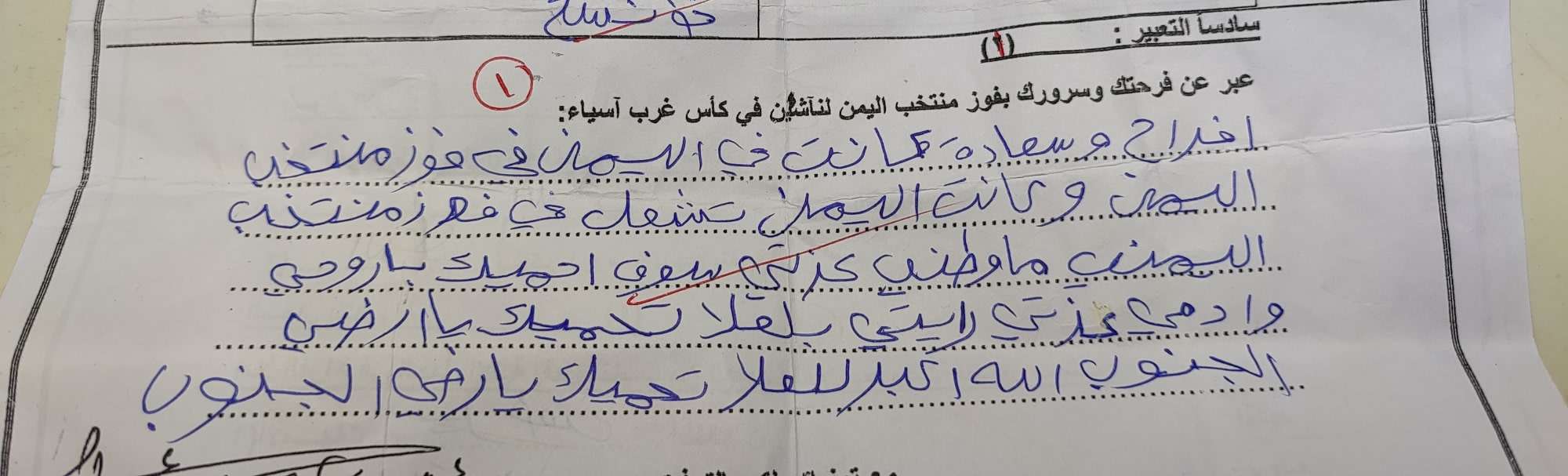 مدرسة الأوائل بجعار وضعت سؤال في الاختبار للطالبات البنات يطلب من الطالبة أن تعبر عن فرحتها وسرورها بفوز منتخب اليمن . ولنا بعض الملاحظات : 1-السؤال وضع للطالبات . 2- نحن لن ندخل في الأهداف المرجوه من السؤال هل كانت أهداف تربوية أم سياسية كنوع من الاستفتاء على الوحدة أم غيرها وذلك حتى لاتقول مدرسة الأوائل نحن نسيس السؤال، ولكن نضع السؤال أمام الجهات ذات العلاقة في المجلس الانتقالي ووزارة التربية والتعليم . 3- ورد في السؤال أخطاء وهي كالتالي : ١_ لناشين والصحيح للناشئين . ٢-آسياء والصحيح آسيا. 4-لماذا لم تقم المدرسة بوضع اختيارات أخرى بجانب السؤال حتى يترك المجال للطالبات باختيار تعبير آخر إن كان السؤال لايخلو من الأهداف السياسية ، وجعل التعبير فقط على هذا السؤال على نحو إجباري. 5-الطالبة الجنوبية ذكرت واكدت أن عشقها للجنوب الوطن الأكبر وعند إجابتها على السؤال قالت أن دمي وعزتي للعلا تحميك يا ارضي الجنوب الله أكبر للعلا تحميك يا أرضي الجنوب. من خلال تلك الأخطاء نستنتج ان الاختبارات لايطلع عليها رئيس الشعبة، ولا يطلع عليها موجه المادة، إنما تتم على طريقة " يامخارج لخجف لا ودف". أين دور فريق توجيه مكتب التربية والتعليم ، هل يزور المدرسة ؟! . ان كان الجواب نعم يزورها ، فأين هو من هذه الكوارث ؟!..