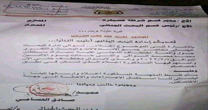 اختطفت فتاة بمحافظة تعز رجلا في واقعة نادرة. وبحسب رسالة رسمية من شرطة تعز فقد طالبت الشرطة الفتاة باطلاق سراح المختطف. وتقول برقية الشرطة ان المواطنة تغريد غالب الشرعي قامت باختطاف مبارك سلطان الوافي. وقالت البرقية ان الواقعة حدثت في السابع من هذا الشهر. ووجه مدير البحث الجنائي بتعز صادق الحسامي رسالة لمدير قسم شرطة عصيفرة طالبه فيها بضبط الجانية واطلاق سراح المختطف. وهذه هي المرة الاولى التي يتعرض فيها مواطن للاختطاف على يد فتاة. وبحسب مصادر محلية تحدثت لصحيفة "عدن الغد" فان تغريدة زوجة سابقة للمختطف. وقامت بتغريد باختطاف زوجها السابق عقب زواجه من أخرى . ونفذت العملية بينما كان الرجل يسير في الشارع العام حيث قامت تغريدة بمعاونة اخوين لها باختطاف الزوج السابق والتوجه به إلى جهة غير معلومة. وحاولت اسرة الزوج الافراج عنه بالطرق العرفية لكنها فشلت في ذلك .