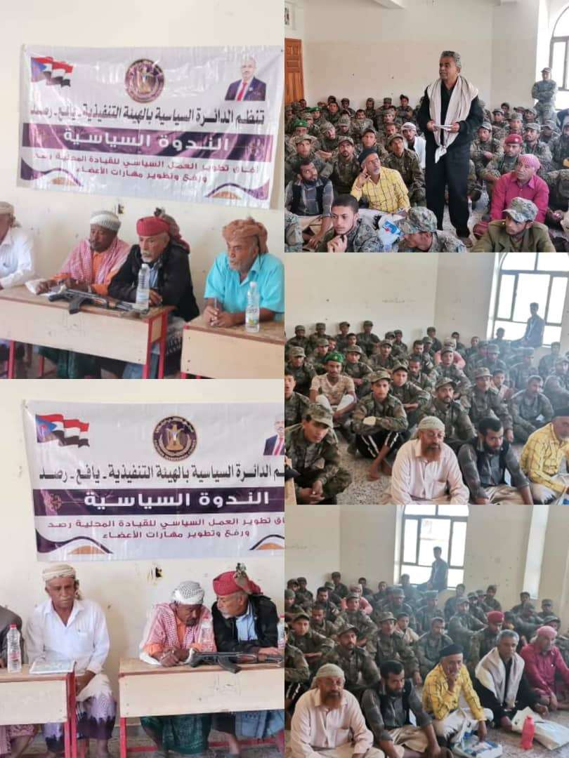 تنظم ندوة سياسية بعنوان : افاق تطوير العمل السياسي لاعضاء القيادة المحلية للانتقالي وقوات الحزام الامني بمديرية يافع رصد.